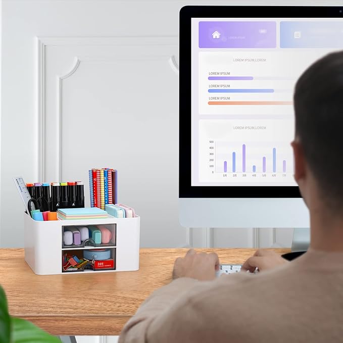 - PRACTICAL and MULTIFUNCTION - This Desktop Storage Box has 2 drawers and 5 large capacity divided compartments, to provide enough space to store your daily essentials for easy access, Transparent drawers allow you to quickly find what you need.Suitable for Office, School, Home living room, Makeup, study, bedroom, children's room, dining room and other spaces.